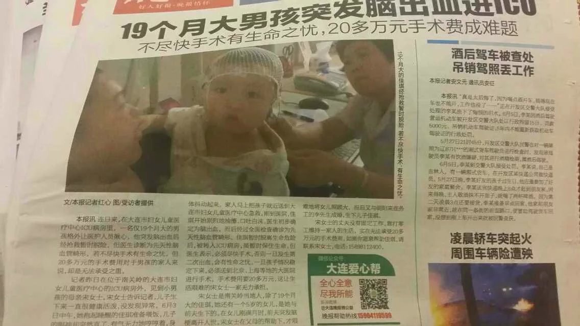 “十分感謝天津宏賀雜糧趙總,孩子的爸爸不知道是誰匯的款,來問我,我也是看了微信才知道的,還要感謝這些關(guān)注并幫助孩子的好心人們,孩子近況還算可以,流入腦干的血己經(jīng)慢慢吸收了,目前沒有生命危險(xiǎn),現(xiàn)在只能等待手術(shù),我們現(xiàn)在也積極的聯(lián)系當(dāng)?shù)氐拿襟w,希望他們也能介入,應(yīng)該大連晚報(bào)周一左右會來采訪,謝謝大家謝謝奇思”。