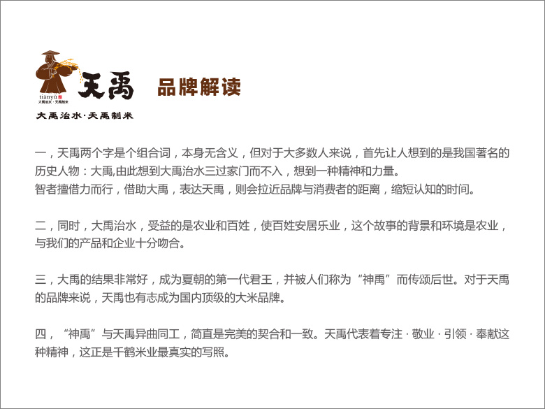 品牌廣告語:大禹治水·天禹制米。來自盤錦五大米業(yè)之一的千鶴米業(yè)蔡桂榮董事長的反饋錄音